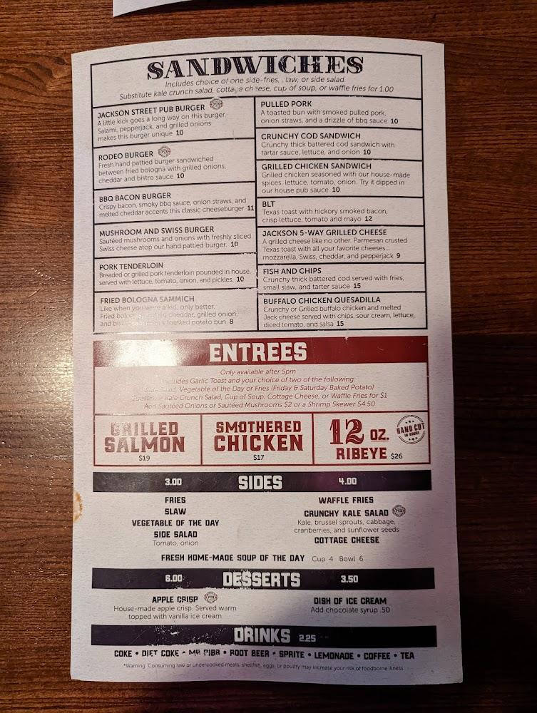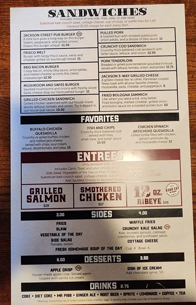 The menu at Jackson St Pub presents an exciting mix of American classics. Appetizers like crab rangoons and spicy cheese curds are perfect starters, while the main dishes shine with burgers, sandwiches, and steak options.
